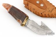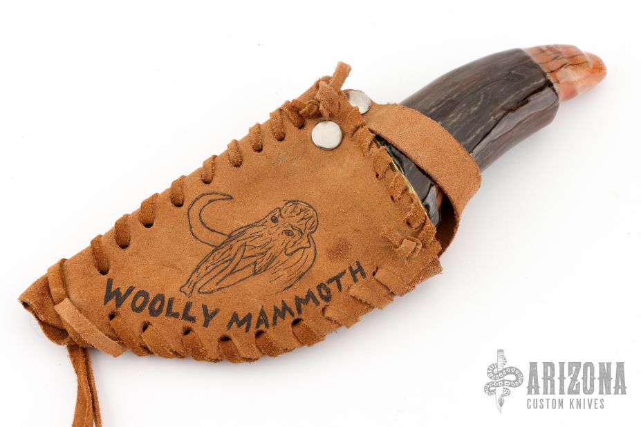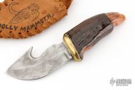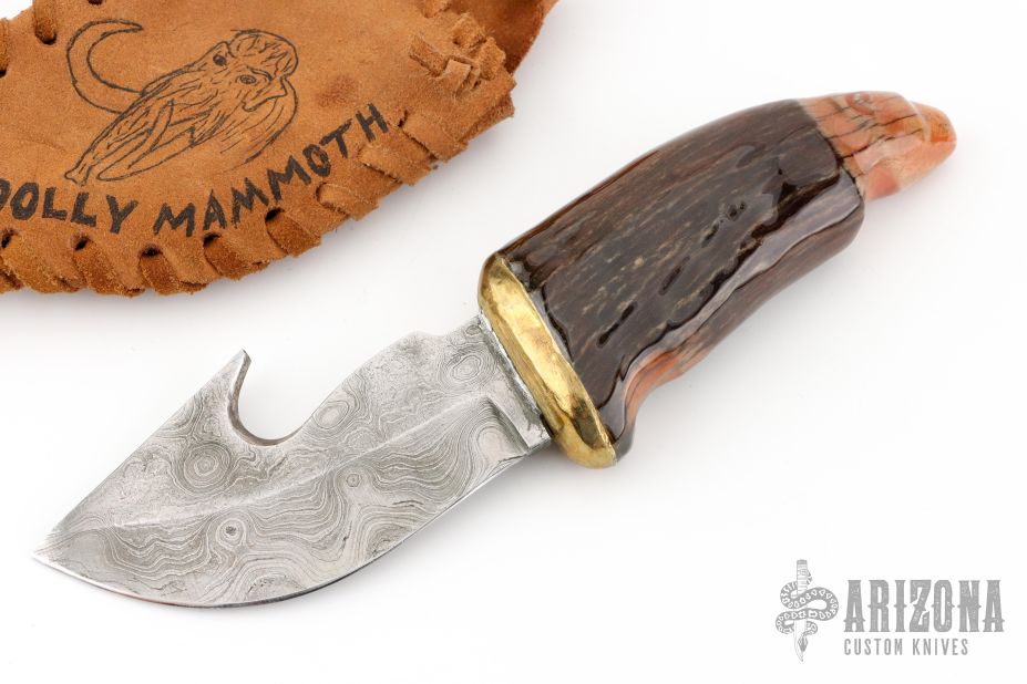 This features a Damascus blade with Guthook, .201" blade stock and 2.12" blade depth, hidden tang construction. The handle has a brass guard and epoxy covered mammoth tooth grip. Pommel has a carved bear head. Comes with a sheath. Has some light scratches, and patina. Great condition otherwise.