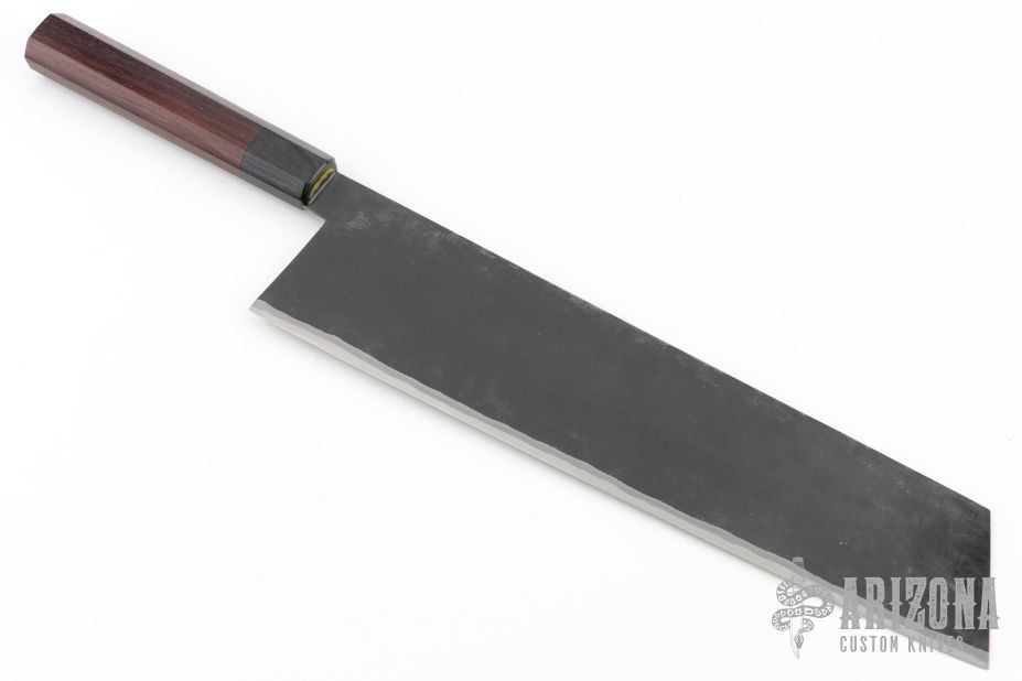 The Kiritsuke is a multi-purpose chef's knife, the newest model from Takeda. The blade is stainless clad Aogami Super Steel (NAS) which is a high-carbon steel alloy with vanadium. As with all of Takeda's knives, it has a strong sharp edge. The octagon shaped wood handle is easy to hold. 281mm cutting edge, .112" blade stock and 2.629" blade depth. Brand new from maker.