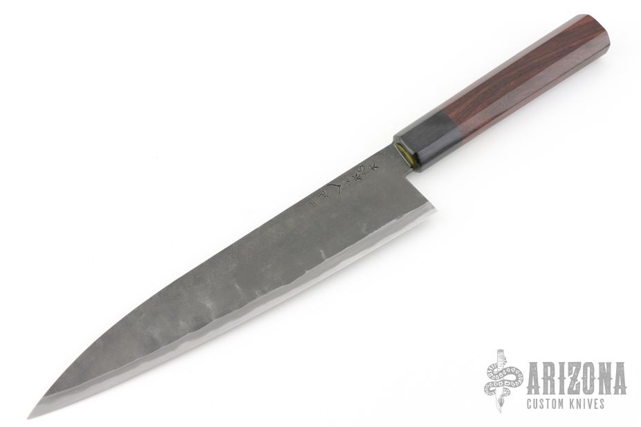 The third-generation master blacksmith Shosui Takeda was born and raised in Niimi, Okayama in Japan. After graduating from a university and working in Tokyo, he returned to his hometown to succeed his father as a blacksmith. Since 1985 he has strived and studied to produce the very best hand-forged blades and tools. His knives are forged by hand with his small staff of master smiths. Each blade holds its edge extraordinarily well and resharpens easily. All his knives have 50/50 edges and octagonal handles so they are good for either right-handed or left-handed users. His good old-fashioned hard work makes for one-of-a-kind knives.