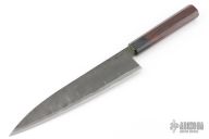 The is a long narrow kitchen knife with a thick blade made from Stainless Clad Aogami Super Steel (NAS) which is a high-carbon steel alloy with vanadium and is ground on both sides. As with all of Takeda's knives, it has a strong sharp edge. The octagon shaped wood handle is easy to hold. 215mm cutting edge, .158" blade stock and 1.743" blade depth. Brand new from maker.
