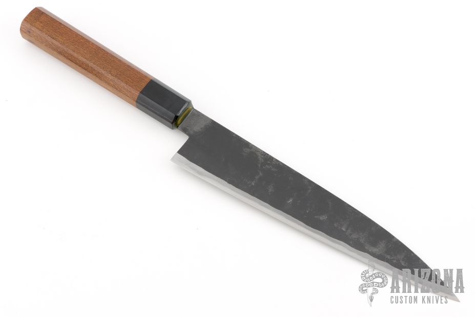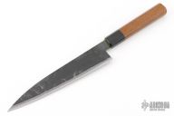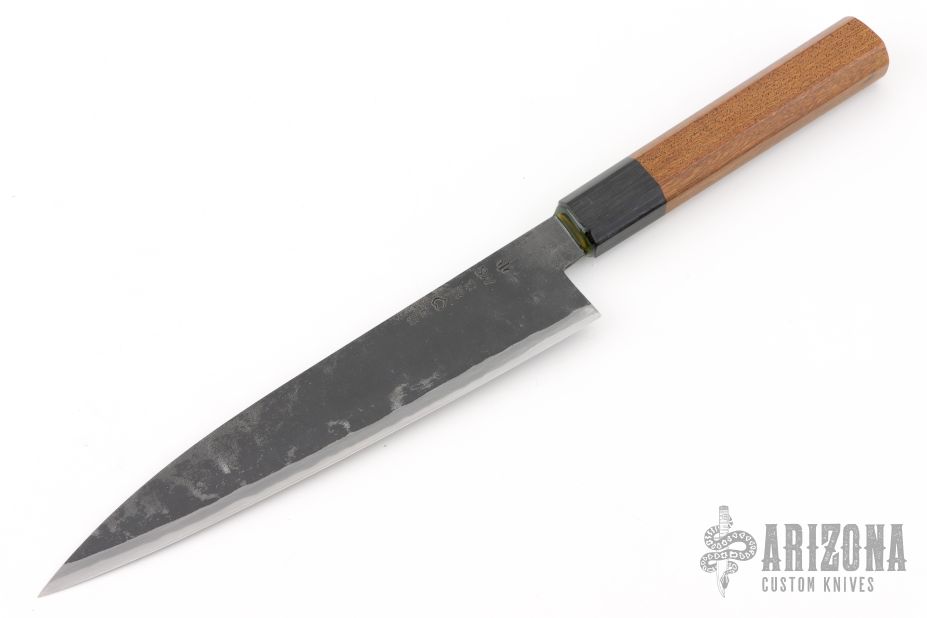 The Yanagiba by Takeda Knives is a long narrow kitchen knife traditionally used for slicing sashimi. The blade is Stainless Clad Aogami Super Steel (NAS) which is a high-carbon steel alloy with vanadium and is ground on both sides, .088" blade stock and 1.464" blade depth, hidden tang construction. As with all of Takeda's knives, it has a strong sharp edge. The octagon shaped wood handle is easy to hold. Comes with original packaging. Brand new from maker.