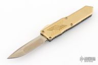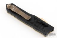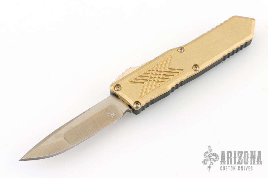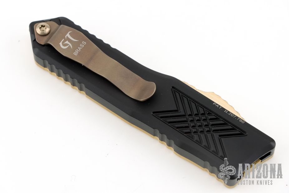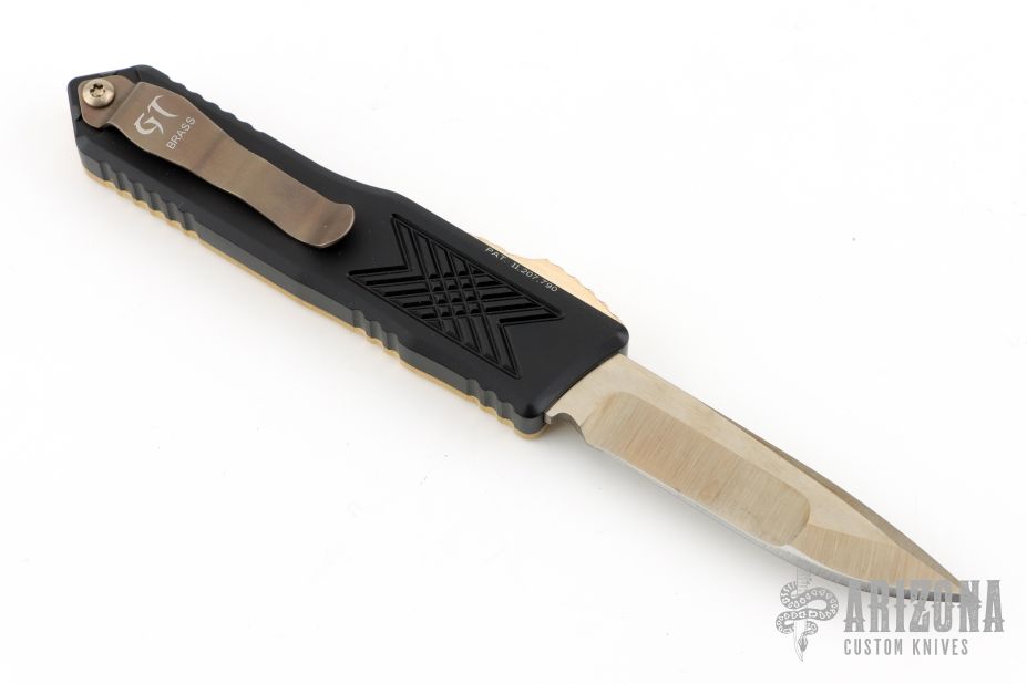 This OTF by Guardian Tactical features a bronzed drop point blade with duplex grind. The handle features a milled aluminum body, brass cover, and push button with tip down clip. Comes with orignial box and papers. Excellent condition.