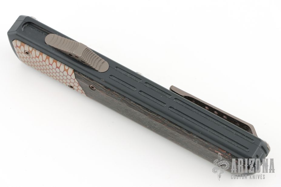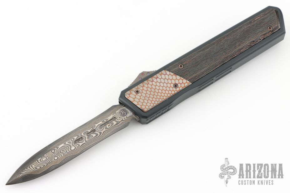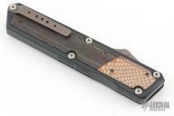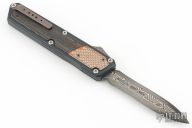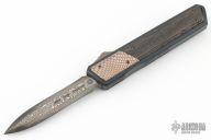 This OTF by Patrick Famin features a San-Mai Damascus dagger blade.  The handle features an aluminum frame with super conductor and copper-woven carbon fiber inlays. Anodize finish hardware. Tip down titanium pocket clip. Excellent condition.