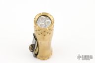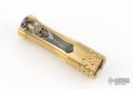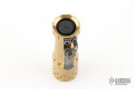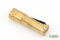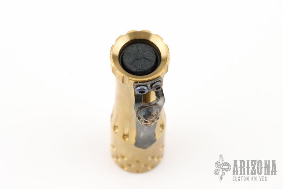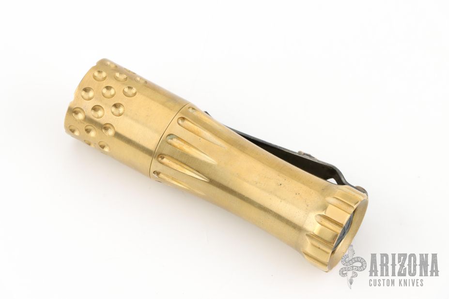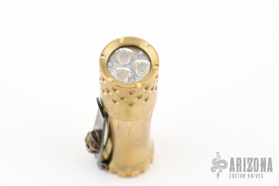 This Malihini flashlight from Mitch Lum/Laulima Metal Craft and Joshua Dawson features a brass body with Steel Flame pocket clip. Nichia 219C 4000k primary LED. Driver: H17B. Carclo. Flat sapphire watch "glass" window. McClicky switch. Uses a single 18350 battery. Has some light scuffs, scratches, and patina. Great condition otherwise.
