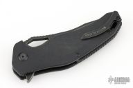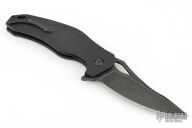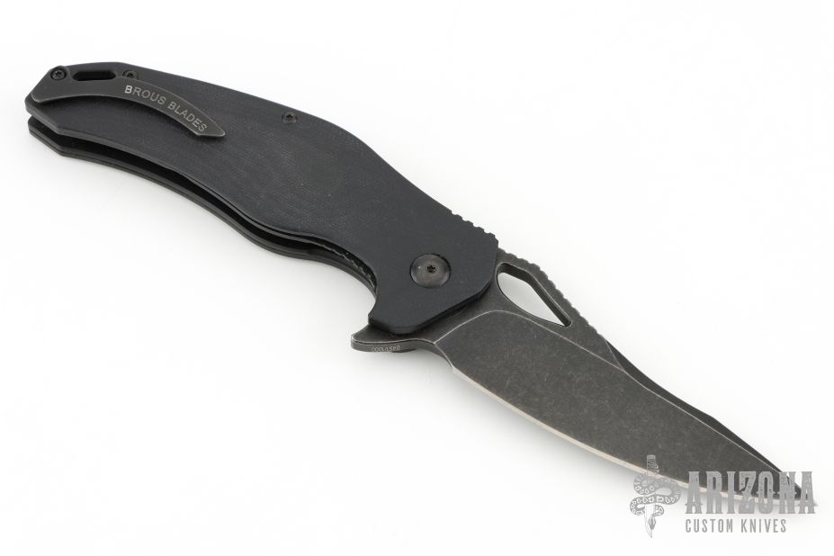 This VR-71 from Brous Blades features a black tumble finished blade with swedge, thumb hole, flipper and notched thumb rest. The handle is comprised of black G10 scales over steel liners. Bead blasted steel tip up clip with lanyard hole in pommel. Numbered 0451/1000 on flipper. Includes padded case and maker's card. Excellent condition.