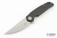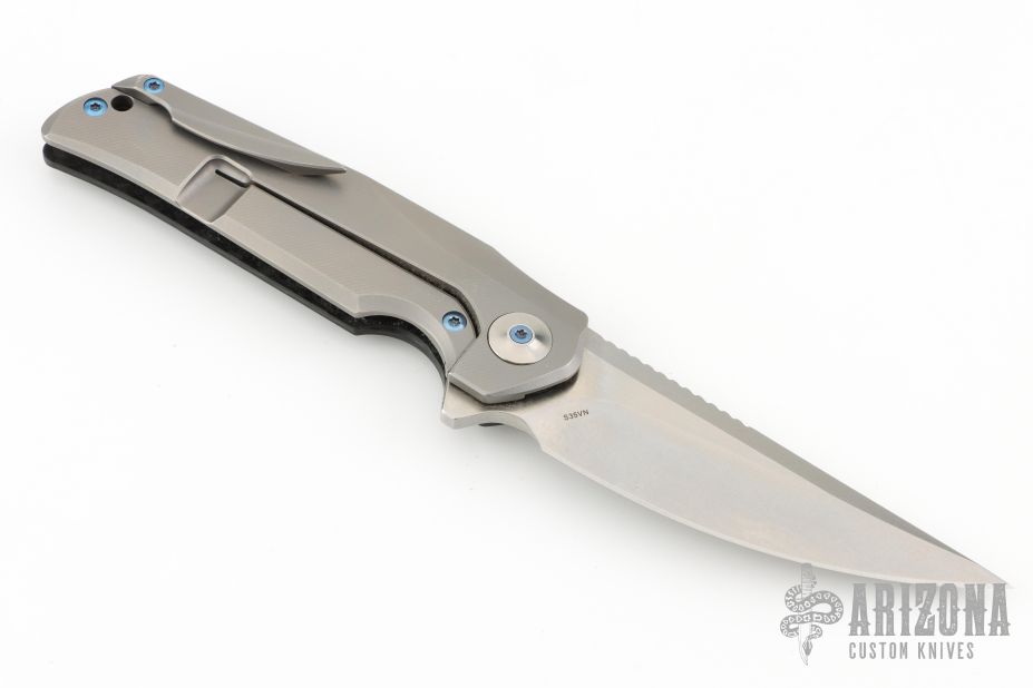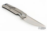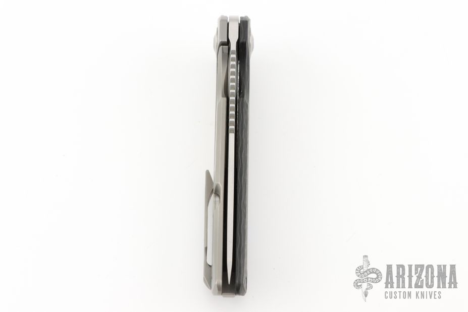 This Tempest Mid-Tech knife by Reate Knives was designed by Liong Mah features a stonewashed upswept S35VN blade with notched thumbrest and swedge. The handle has a bead blasted titanium and carbon fiber frame and tip up clip. Rides on raced bearings. Has anodized titanium hardware. Nice detent, lockup and blade seating. Comes with Maker's nylon zippered case. Has a couple light scratches, otherwise Excellent condition.