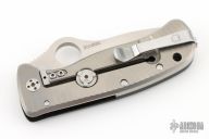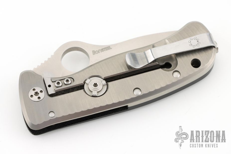 To ensure superior lock reliability, the Lil’ LionSpy’s advanced R.I.L. mechanism features a hardened steel insert and LionSteel’s patented RotoBlock device. This titanium disk serves as an overtravel stop for the lock bar. When the blade is opened, turning the RotoBlock clockwise wedges the lock bar in place, preventing unintentional release of the lock and providing outstanding stability during hard-use cutting chores. Rotating the RotoBlock counterclockwise frees the lock bar and allows it to be operated to close the knife.