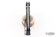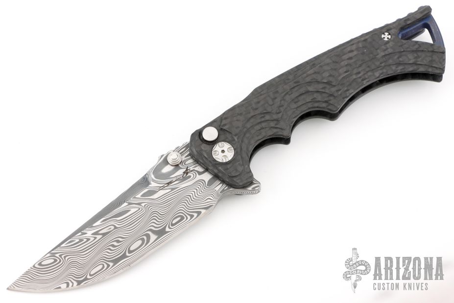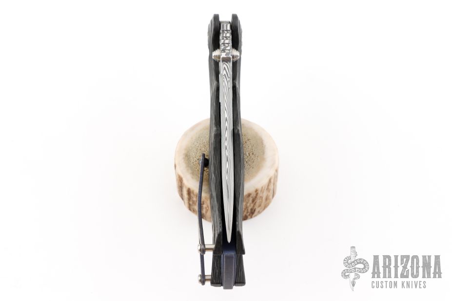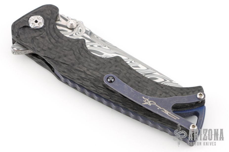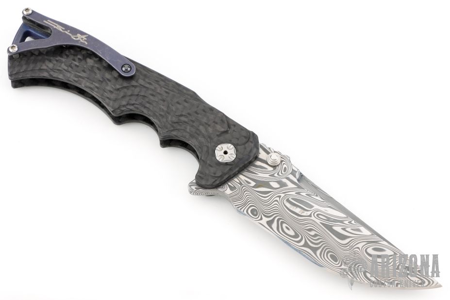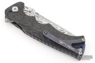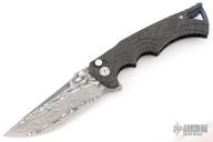 This Tighe Breaker Flipper by Brian Tighe features a Damasteel blade with dual thumb studs, notched thumbrest and a flipper. The handle has a milled, marbled carbon fiber frame with deep finger grooves, notched backstrap with lanyard bail, and darkened tip up clip, lanyard hole at the butt. Smooth flipper action. Nice blade seating and lockup. Excellent work. Comes with maker's nylon zippered case. Has a couple light scuffs and scratches on the clip. Excellent condition otherwise.