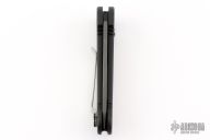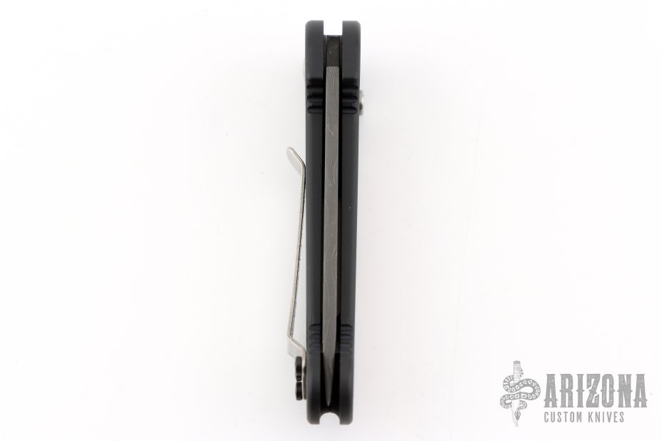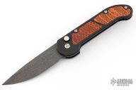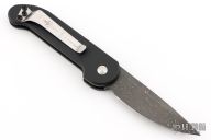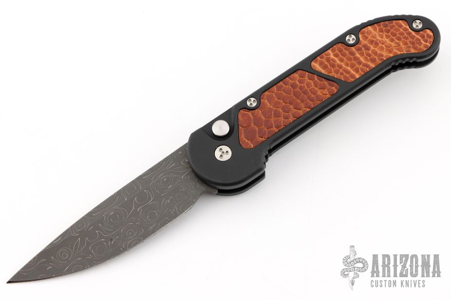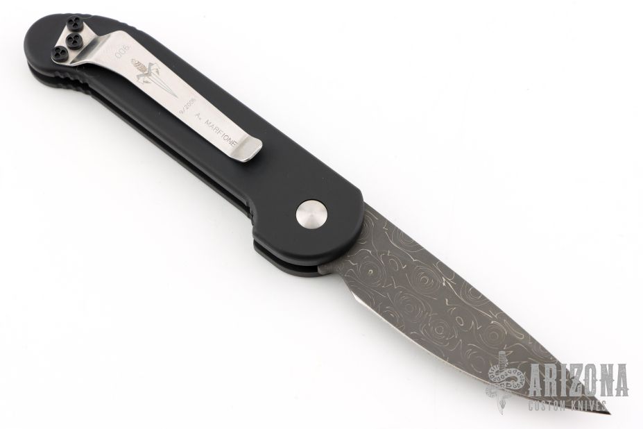 This Mini UMS from Microtech has a hollow ground Damascus drop point blade with crowned blade spine. Side opening coil-spring automatic with black aluminum body, inlays that have been replaced with very nice leather. Satin finished tip up clip dated 9/06 #006 with dagger logo. Comes in a zipper case, and a printed email from Microtech verifying the knife's authenticity but stating the inlays are not original. Excellent condition.