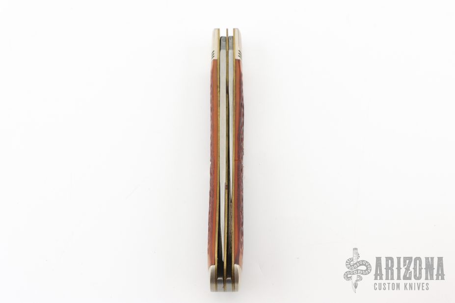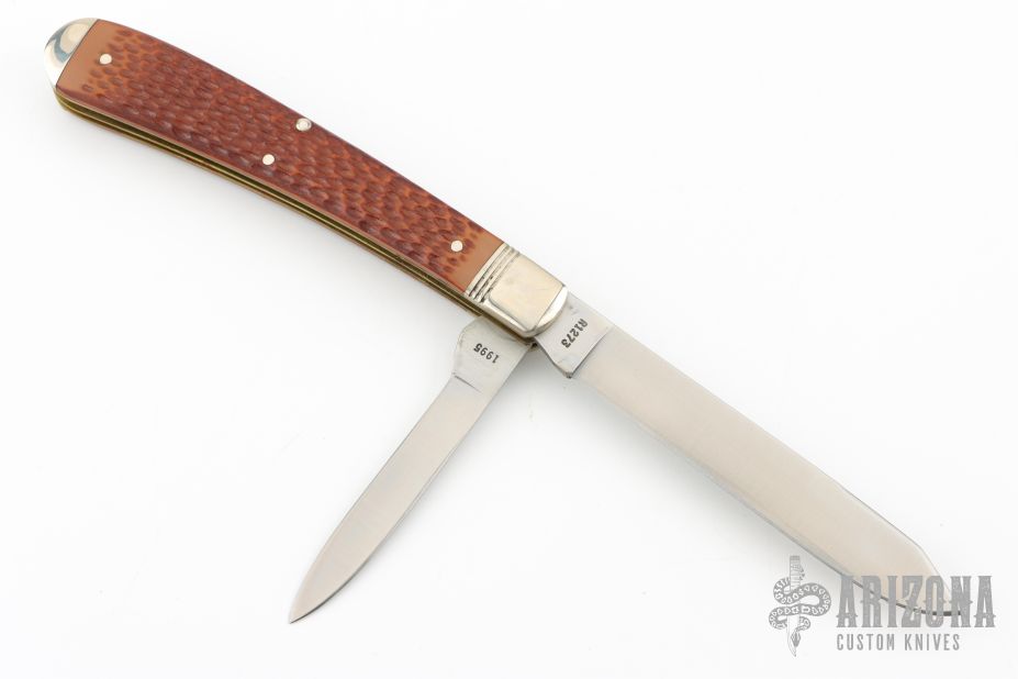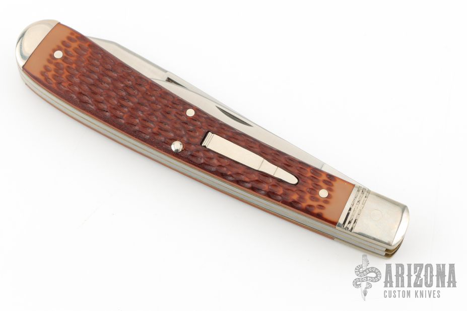 This Bullet Knife was the Remington Collector's Series Knife. Includes original box and paperwork.  This knife has two satin finished blades with nail nicks. The handle has nickel silver bolsters, faux jigged bone covers, brass liners and steel springs. Comes with original box and papers. Excellent condition.