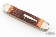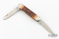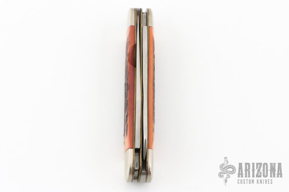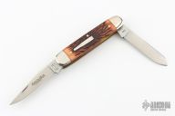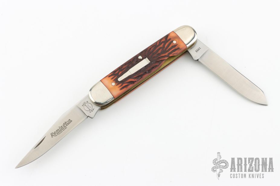 This Limited Edition Bush Pilot Silver Bullet Knife by Remmington has two satin finished blades with nail nicks. The handle has nickel silver bolsters, faux stag covers, brass liners and steel springs.  Comes with original box and papers. Excellent condition.