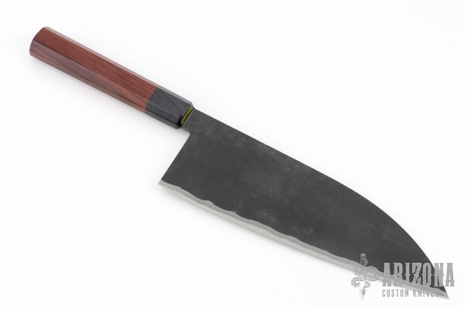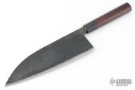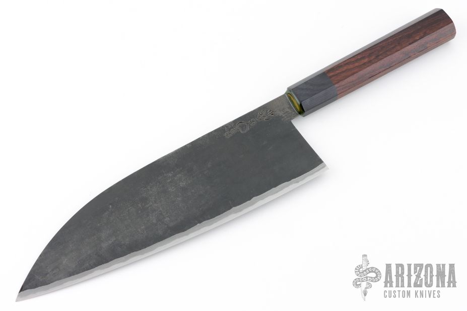The Gyuto by Takeda is traditionally used for cutting a head of cabbage or slicing meat. The blade is stainless clad Aogami Super Steel (NAS) which is a high-carbon steel alloy with vanadium, .105" blade stock and 2.600" blade depth, hidden tang construction. As with all of Takeda's knives, it has a strong sharp edge. The octagon shaped wood handle is easy to hold. 225mm cutting edge. Comes with original box. New from maker!