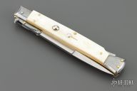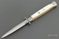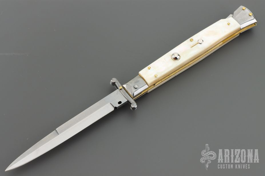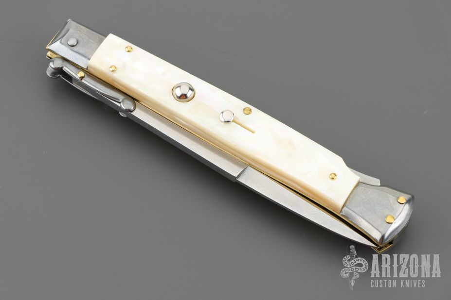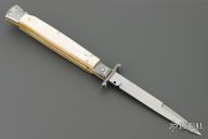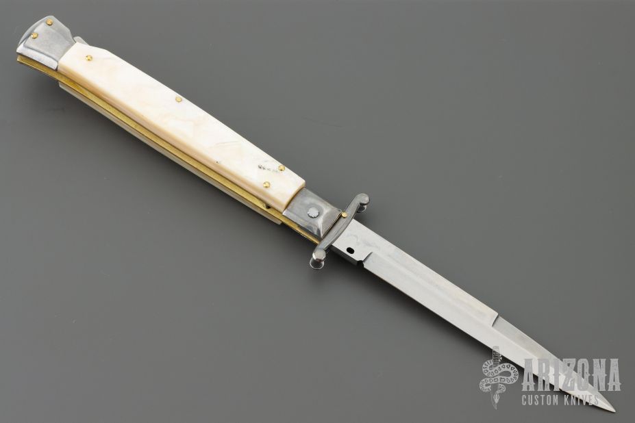 This 11" Swing Guard Auto by Frank Beltrame features a polished bayonet ground blade with false top edge. File work on the blade spine and backstrap. The handle has stainless steel bolsters, front and rear, mother of pearl scales, brass liners, stainless spring. Excellent condition.