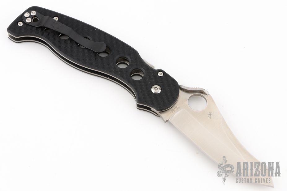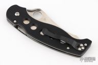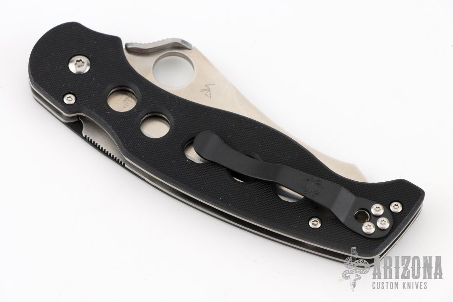 This ATR 2 by Spyderco features a satin finished 3.5" blade with thumbhole and notched thumbdisc. The handle has black G-10 scales with stainless steel liners and a tip up reversible black stainless steel clip. 8.5" overall and 5.125" closed. Nice detent, lockup and blade seating. Comes with original box and papers. New condition.