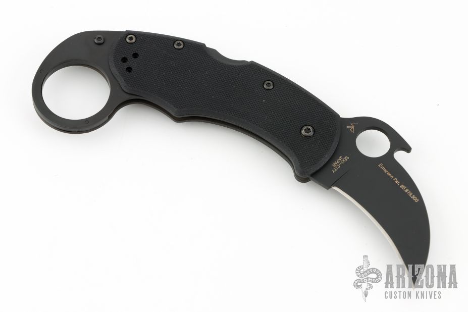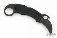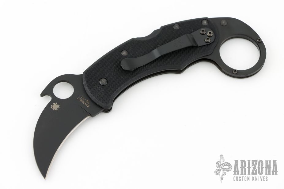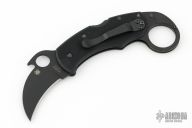 This Karahawk by Spyderco features a black hawkbill blade with thumbhole and wave feature. The handle has black G-10 scales with stainless steel liners and backspacer, tip up black stainless clip, left or right reversible. Comes with original box and papers. New condition.