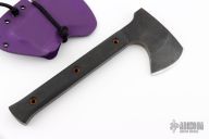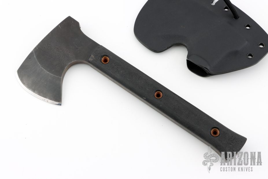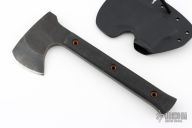 This Custom hatchet by Ben Tendick features a black blade with .379" blade stock and full tang construction. The handle has black terotuff scales with flanged copper tube pins. Comes with 2 kydex sheaths with elastic retention bands. Has some scuffs and scratches, otherwise good condition.