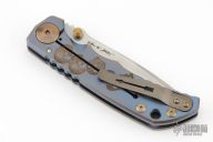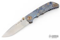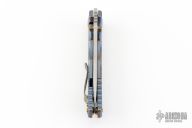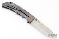 This Harsey framelock folder by Spartan Blades features a stonewashed drop point blade with dual thumbstuds and a notched thumbrest. The handle has an anodized titanium frame with a laser engraving a tip up titanium clip and filler tab. Has nice detent, lockup, and blade seating. Comes with a zippered case. Excellent condition.