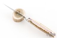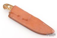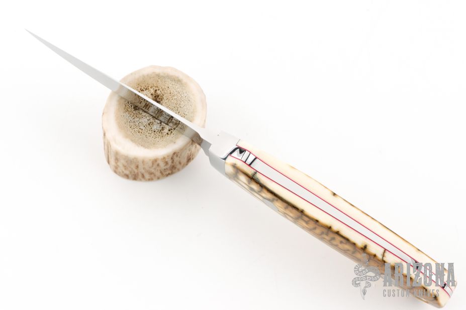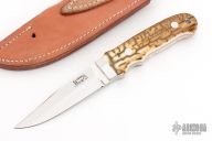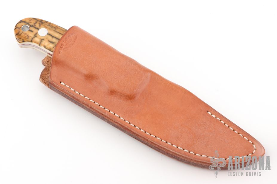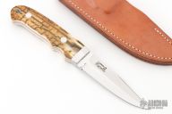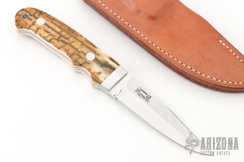 This New York Special by Mike Lovett features a mirror polished blade with sharpened top edge, .185" blade stock and 1" blade depth, full tapered tang construction. The handle has a stainless steel guard, mammoth ivory scales with red liners and a lanyard hole. Comes with a brown leather sheath. #376. Excellent condition.