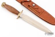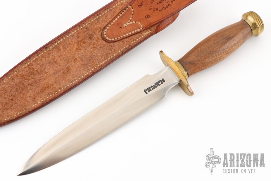 The Model 2-7 by Randall Made Knives is a heavily made dagger or dirk. Brass guard with scalloped collar, walnut handle, brass scalloped butt cap, black spacers. Double edged satin finished blade, .237" blade stock and 1.305" blade depth, hidden tang construction. Comes with a Johnson Roughback brown leather sheath. Excellent condition.