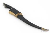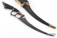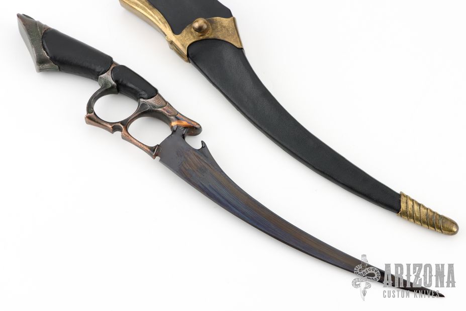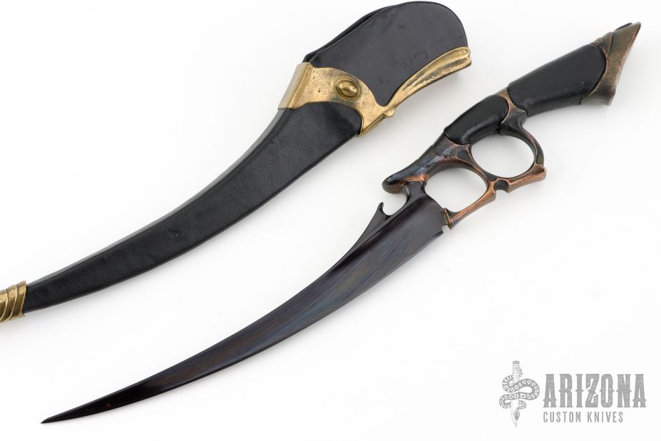 Virgil England's "Shantu Skate" Dagger. This elegant finger-grip dagger is carried by the Shantu, the dispensers of justice in Virgil's "Hetlands" tales. The Shantu Skate Knife is a 7-1/4" sweep of strongly convex and blackened, tempered steel. The handle is leather. The butt, integral double ring guard and thumb support are coppered steel. Black leather sheath with coppered steel accents added.