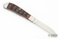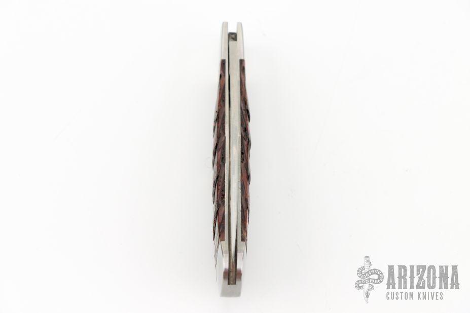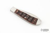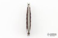 This Slipjoint by Rick Nowland features a wharncliffe blade with hand rub satin finish and nail nick. The handle is stainless steel with integral liners, armadillo hide covers, and stainless spring. Has half-stop, flush in all positions. Has some light scratches, excellent condition otherwise.