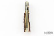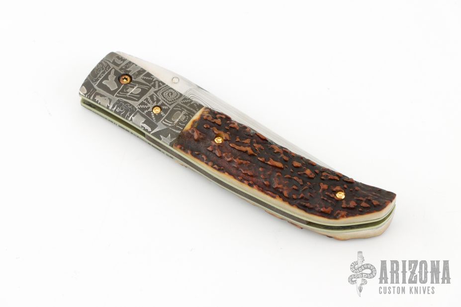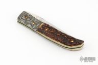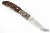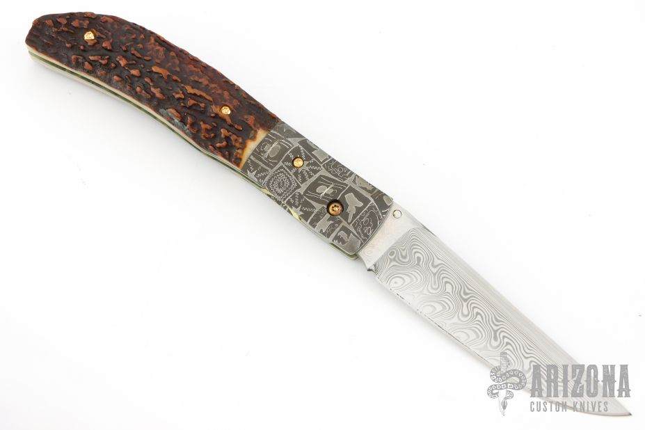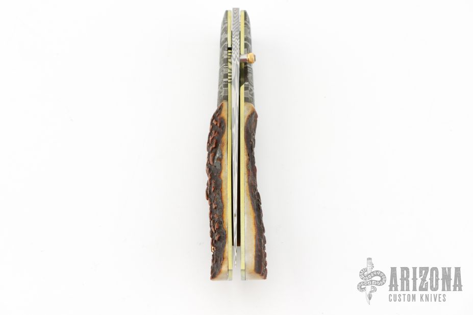 This linerlock folder by RB Johnson features a Damasteel blade with a single thumbstud. The handle has Mosaic Damascus bolsters, stag scales, anodized titanium liners, 24k gold plated screws and a Damascus backspacer. Great looking materials. Nice detent, lockup and black seating. Very nice work. Excellent condition.