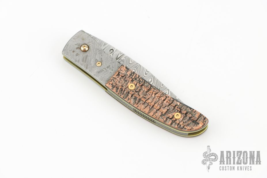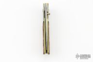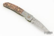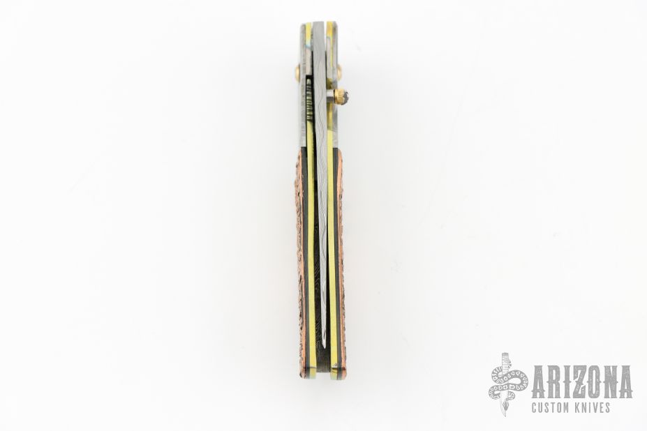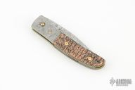 This linerlock folder by RB Johnson features a Damasteel blade with a single thumbstud with purple stone inlay. The handle has meteorite bolsters, textured copper scales with black liners, anodized titanium liners, 24k gold plated screws and a fileworked Damascus backspacer. Nice detent, lockup and black seating. Very nice work. Excellent condition.
