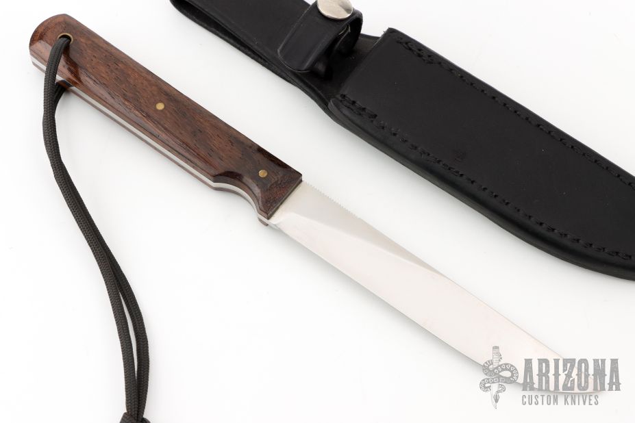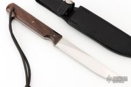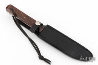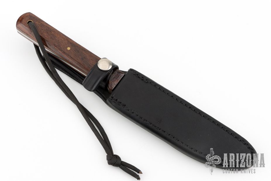 This Model 10 Salt Fisherman and Household Utility features a satin finish drop point blade with notched thumbrest, .119" blade stock and .844" blade depth. The handle has wood scales over full tang construction. Brass lanyard tube with lanyard in pommel. Includes a black leather sheath. Excellent condition.