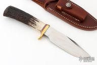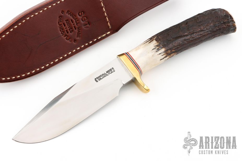 This Sergeant's Special by Randall Made Knife features a satin finished blade with sharpened top edge and a notched thumbrest, .202" blade stock and 1.359" blade depth, hidden tang construction. The handle has a brass guard with a stag grip and red/white/blue spacers. Comes with a brown leather sheath and a Randall zippered case. Excellent condition.
