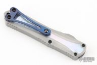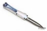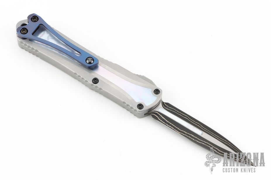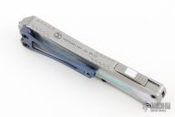 This Manticore S by Heretic Knives features a double-edged Baker Forge Double Shim Damascus blade with mother of pearl inlays in the flats. The handle has a two-tone stainless steel frame with mother of pearl inlays, stainless steel thumb slide with mother of pearl inlay, and a tip down blue anodized titanium clip with ball bearing. Comes with original box and zippered case. #017 and dated 02/24. Excellent condition.