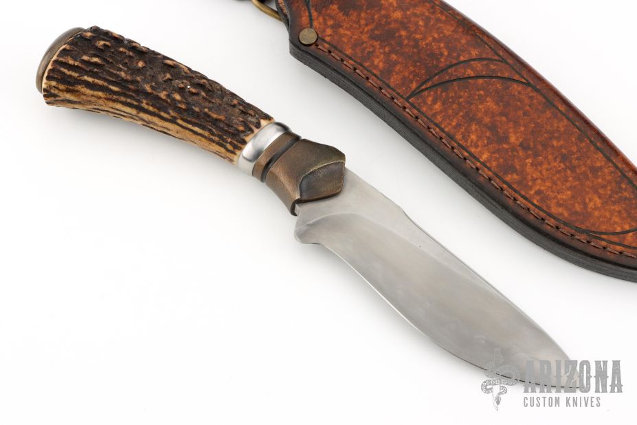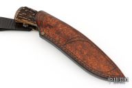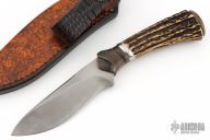 This Hunter by Anders Hogstrom features a carbon steel blade with nice hamon, .244" blade stock and 1.298" blade depth, hidden tang construction. The handle has a textured brass guard, beautiful stag grip with steel spacer, and brass butt cap. Comes with a hand tooled brown leather sheath. Excellent condition.