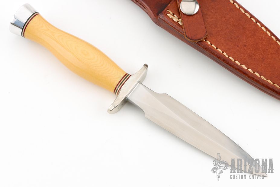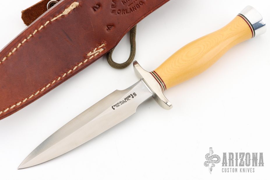 This Model 2-4 by Randall Made Knives features a satin finished double edged blade, .167" blade stock and .914" blade depth, hidden tang construction. The handle has a nickel silver guard and duralumin butt, yellow paper micarta grip with red/white/blue spacers. Comes with brown leather sheath. Excellent condition.