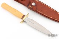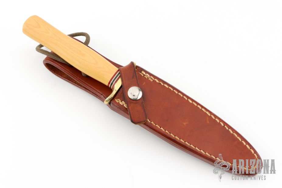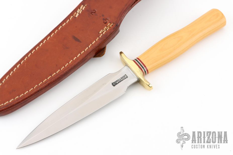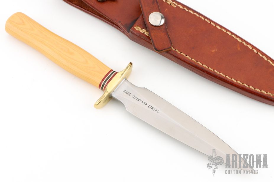 This Model 2-5 by Randall Made Knives features a satin finished double edged blade, .157" blade stock and 1.016" blade depth, hidden tang construction. The handle has a brass guard, yellow paper micarta grip with red/white/blue spacers. Comes with brown leather sheath. Excellent condition. Has "Raul Quintana Cintas" on the blade.