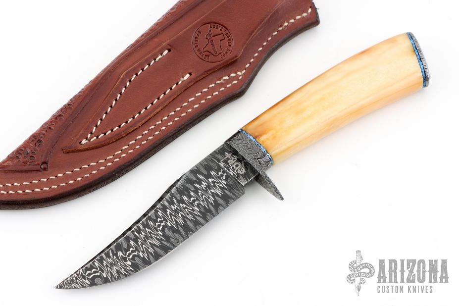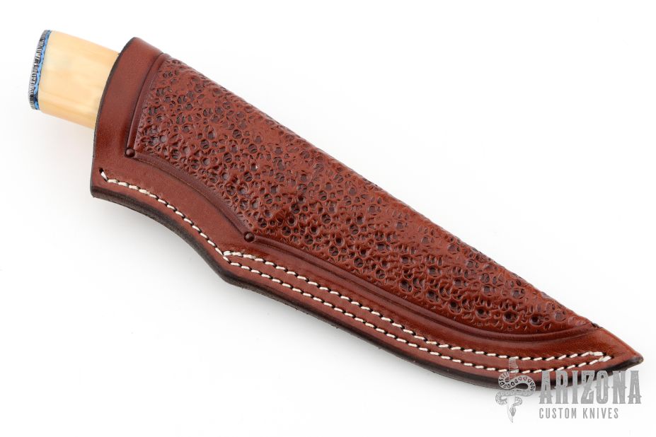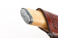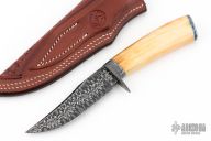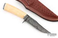 This knife by Curt Zimmermann features a Mosaic "Heartbeat" Damascus blade with false top edge and .144" blade stock and 1.001" blade depth, hidden tang construction. The handle has a Damascus guard and butt, fileworked and anodized titanium spacers, fossil walrus ivory grip. Comes with a hand tooled brown leather sheath. Excellent condition.