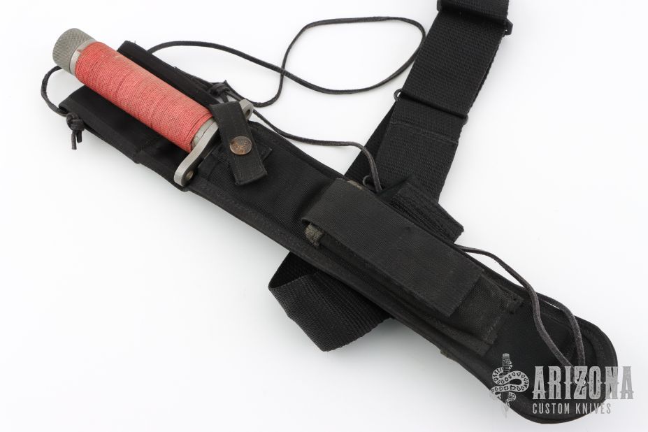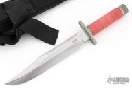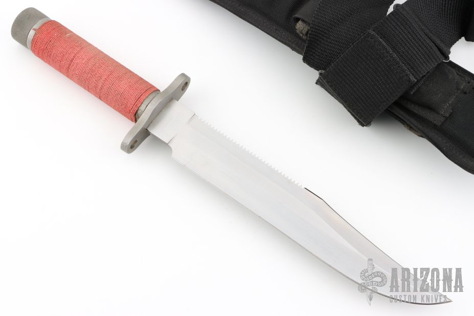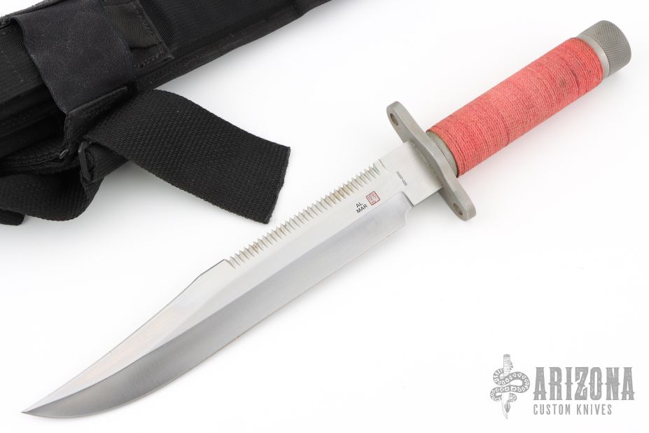 This SF-10 from Al Mar Knives is a large hollow handled survival knife with super sharp serrations on spine, .235" stock and 1.553" blade depth. Screw off handle cap and cord wrapped handle. Comes with a black nylon sheath with belt loop. Hard to find piece. Has some light scratches, otherwise excellent condition.