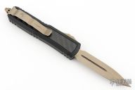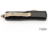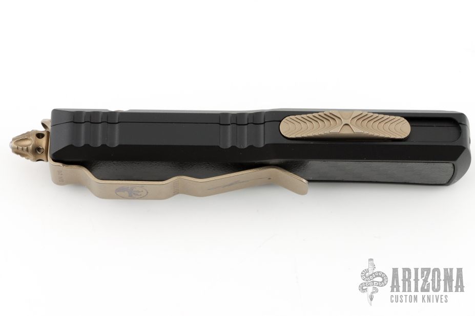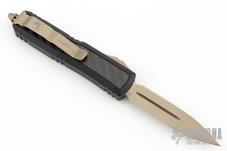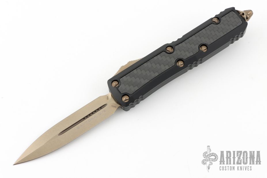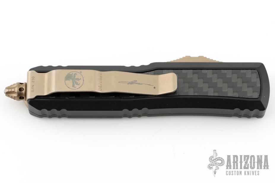 This Daytona OTF automatic features a D/E bronze tumble finished blade with standard edges, and carbon fiber inlays in the black aluminum handle. Tip down bronzed and tumbled stainless clip and hardware. Serial number 210 and dated 08/2022. Comes with original box and papers. Excellent condition.