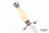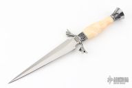 This Dagger by Willie Rigney features a double-edged blade with a hand rubbed satin finish, .252" blade stock and 1.150” blade depth, hidden tang construction. The handle has an engraved stainless steel guard, butt and collar, fossil walrus ivory grip with spiral fluted with flower carving and a small gold pin in the center of each flower. Comes with a zippered case. Engraving done by Julie Warenski. Has a couple naturally occurring cracks in the grip, otherwise excellent condition.
