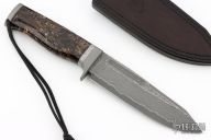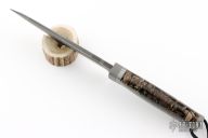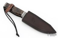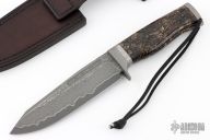 This Sergeant Beauty by Petr Weingartner features a San Mai Stainless Damascus blade with Elmax core, fullers and notched thumbrest, .215" blade stock and 1.483" blade depth, hidden tang construction. The handle has a bead blasted stainless steel guard and butt, stabilized cross-cut mammoth ivory handle with a Muonionalusta Meteorite spacer. Lanyard hole in pommel. Includes a black leather sheath with belt loop. New condition. Comes with a COA dated 5-19-2025