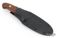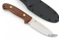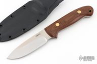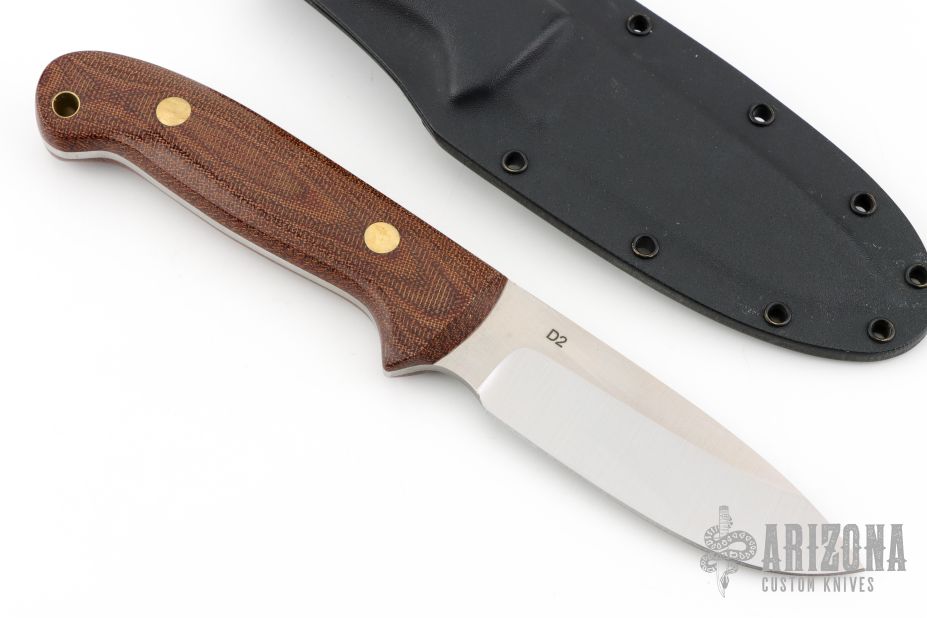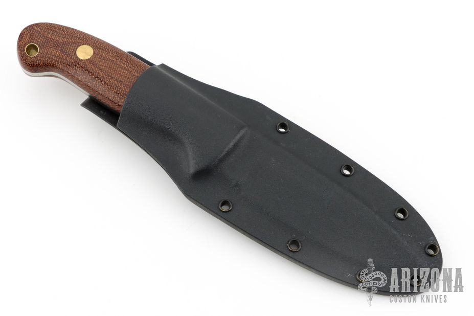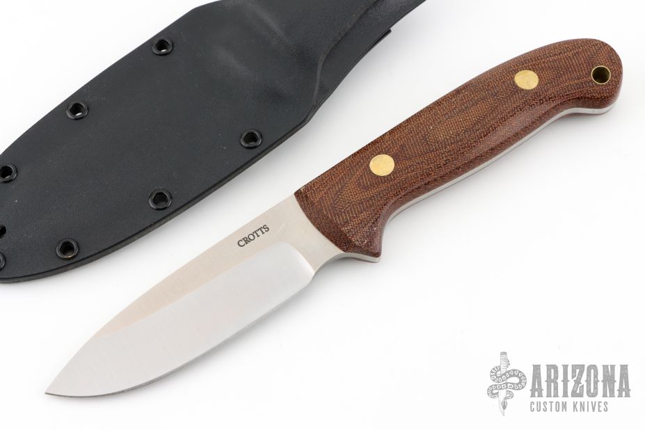 This Mountaineer from Dan Crotts features a satin finish drop point blade. .123" blade stock and 1.152" blade depth. The handle has brown micarta scales, brass pins and lanyard tube over full tang construction. Includes kydex sheath with belt loop set up for horizontal carry. Excellent condition.