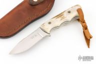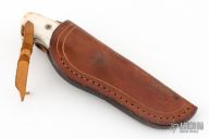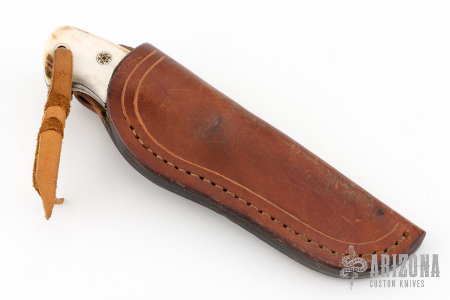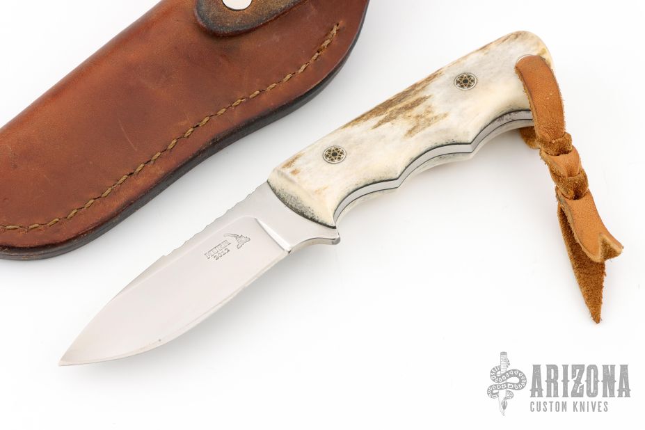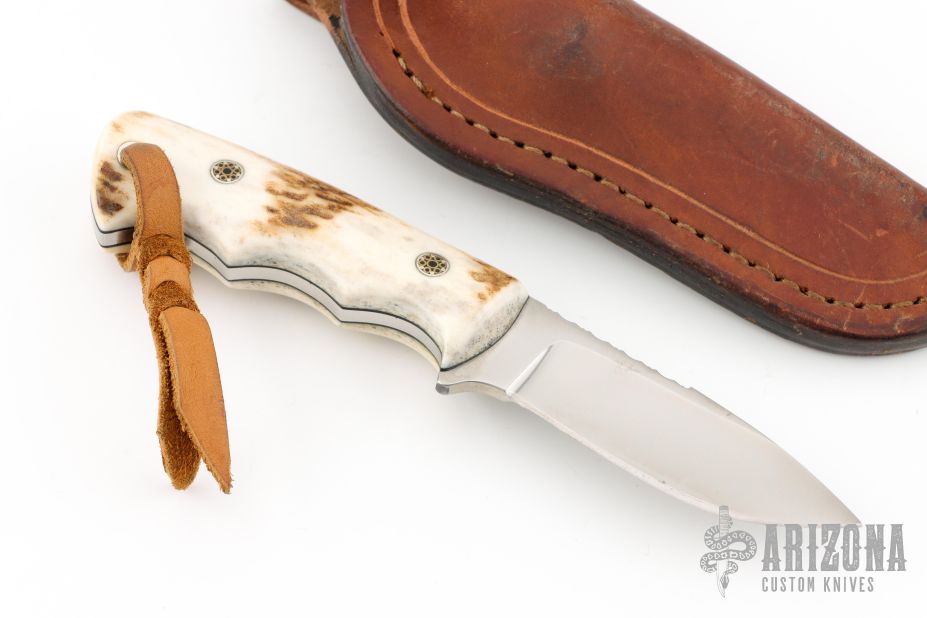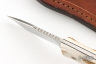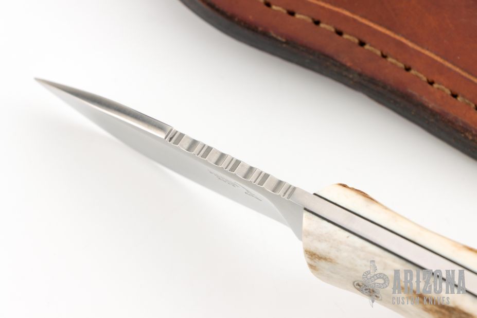 This custom knife by Keith Murr features a polished blade and elk horn handle. .134" blade stock. .959" Blade Depth. File work on thumbrest. Full tang construction. Great feel in the hand. Very nice work.  Includes a leather belt sheath.  Excellent condition.