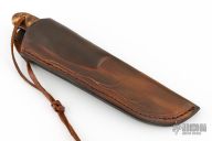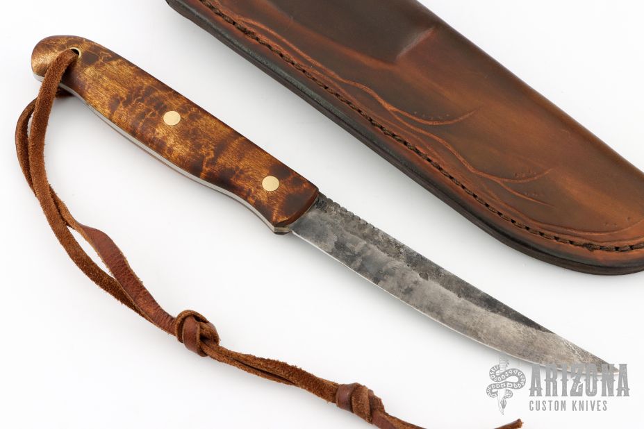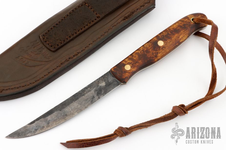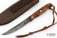 The Hunter/Skinner, from ML Knives features a clip point blade forged from 1095 high carbon steel. The knife has a full tang; the handle is composed of birdseye maple. The knife comes with a leather sheath made from 100% American Tanned leather as well as a certificate of authenticity. Excellent condition.