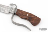 This Bowie by Mark Fleming features a Damascus clip point blade with sharpened top edge, .276" blade stock and 1.477" blade depth, hidden tang construction. The handle has a matching Damascus S-guard, collar, and wood grip with single pin. Comes with a zippered case and maker's card. Has some light scuffs. Excellent condition.