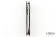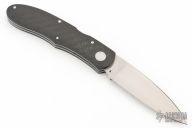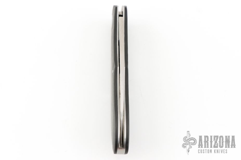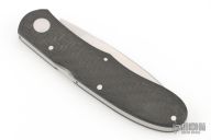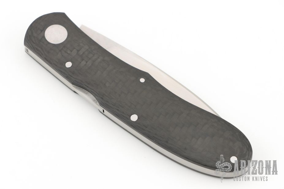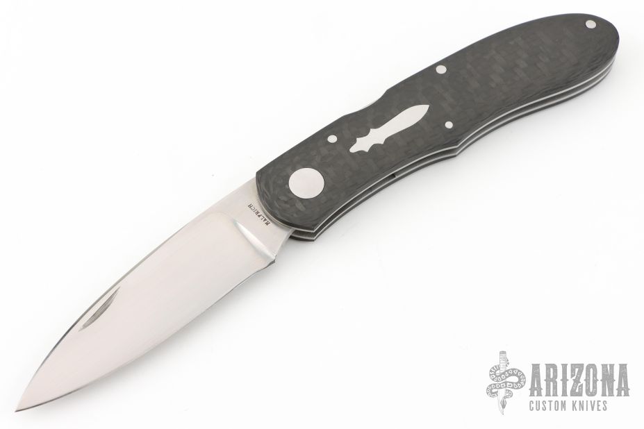This Rounder by Jerry Halfrich features a hand rub satin finished with a nail nick. The handle has satin finished and fluted stainless steel bolsters/liners/spring, carbon fiber covers with stainelss steel escutcheon. Has some light scratches, otherwise excellent condition.