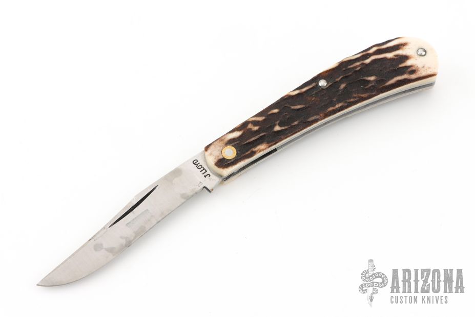 This slipjoint by JH Lloyd features a satin finish drop point blade with a single long pull nail nick.  The handle features stag covers over steel liners and backspring. Half-stop flush in all positions. Has some scuffs and patina. Great condition otherwise.