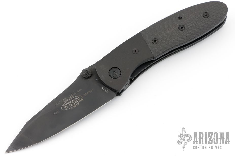 This Lightfoot LCC D/A side opener by Microtech has a black blade, black aluminum bolsters, and carbon fiber scales. Stainless steel clip and liners. Dated 09/2001 and #6345. Includes original box, papers, lanyard (not attached) and microtech lightfoot nylon belt sheath. Has some scuffs and scratches, great condition otherwise.