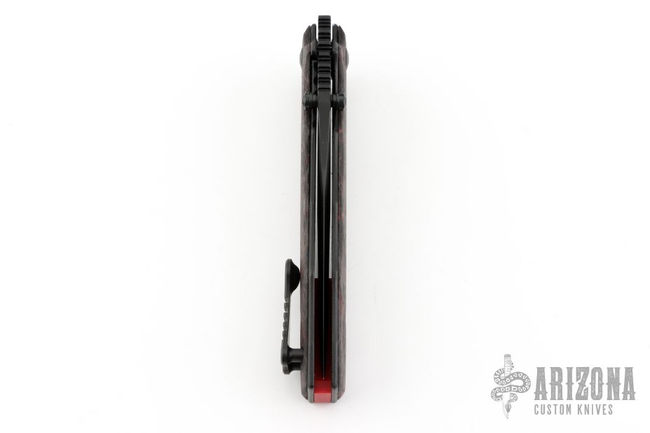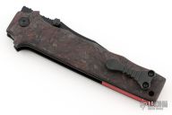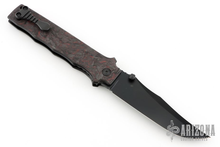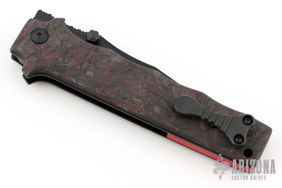 This MAC V SOG folder by Allen Elishewitz features a black DLC blade with notched thumbrest and dual thumbstuds. The handle has black/red Fat Carbon scales, textured and DLC coated titanium liners, red G-10 backspacer, tip up black DLC titanium clip. Nice detent, lockup and blade seating. Comes with original leather case and COA. New from maker at the 2025 Blade Show.
