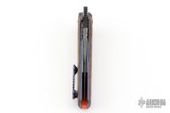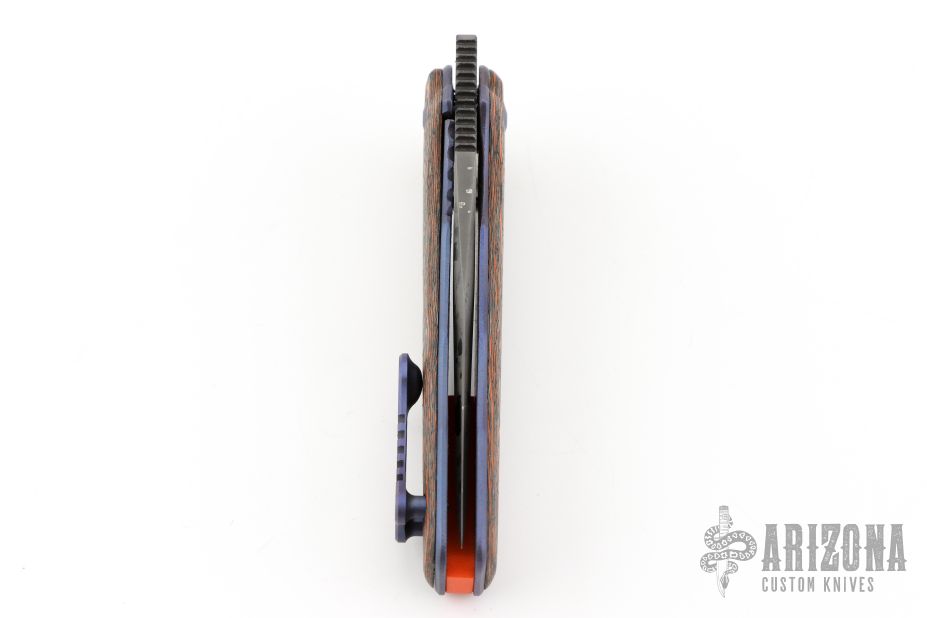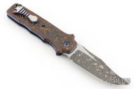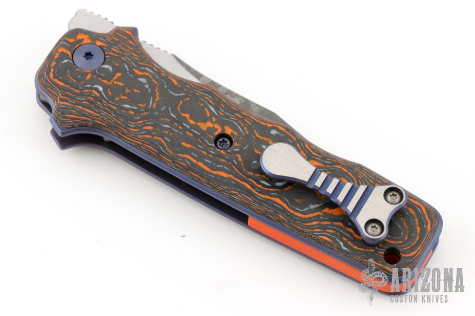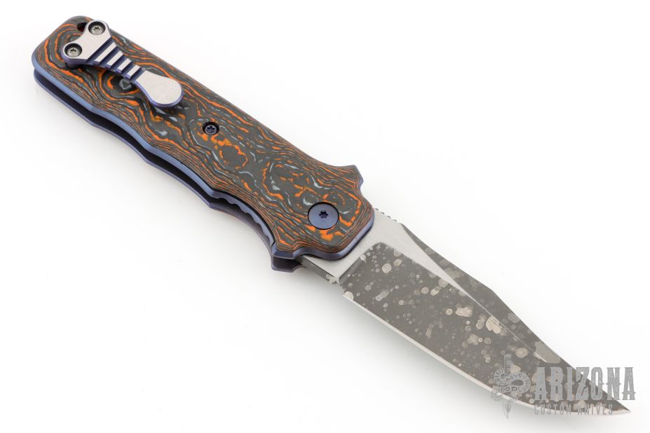 This Mini MAC V SOG folder by Allen Elishewitz features a "Black Snow" finished blade with notched thumbrest and front flipper. The handle has Camo Carbon scales, textured and anodized titanium liners, orange G-10 backspacer, tip up titanium clip. Nice detent, lockup and blade seating. Comes with original leather case and COA. New from maker at the 2025 Blade Show.