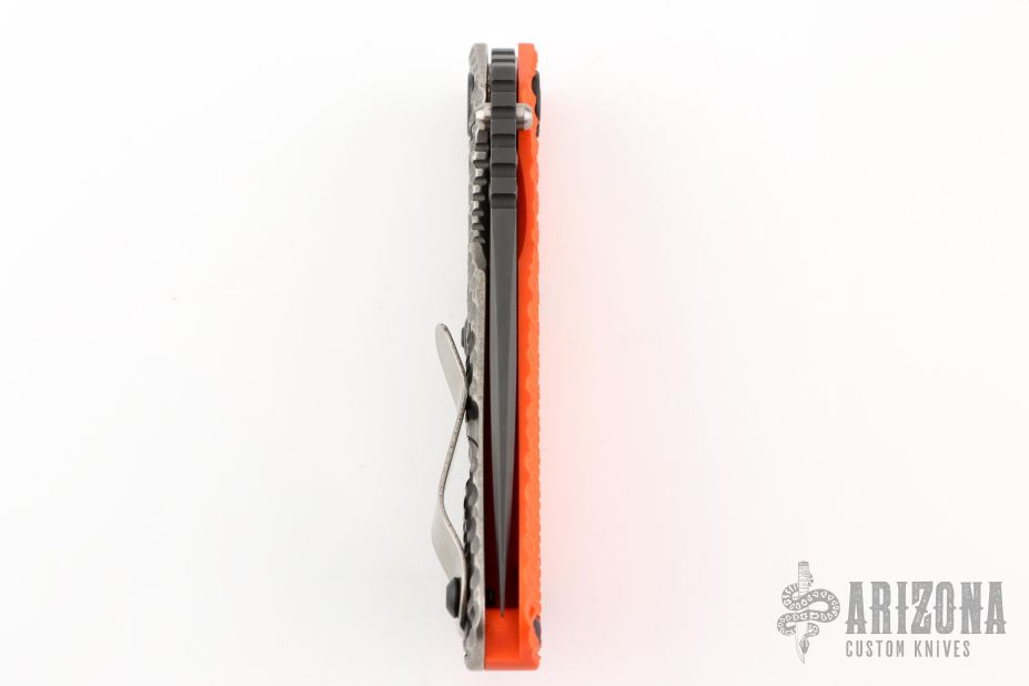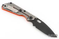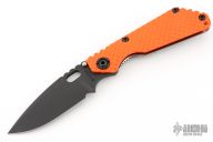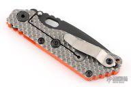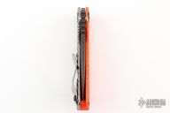 This SNG GG by Strider has a black spear point blade with dual thumb studs, thumbhole, and notched thumb rest. Handle is orange G10 and titanium frame, with lockbar stabilizer and a matching tip up clip. Nice detent, lockup and blade seating. Excellent condition.