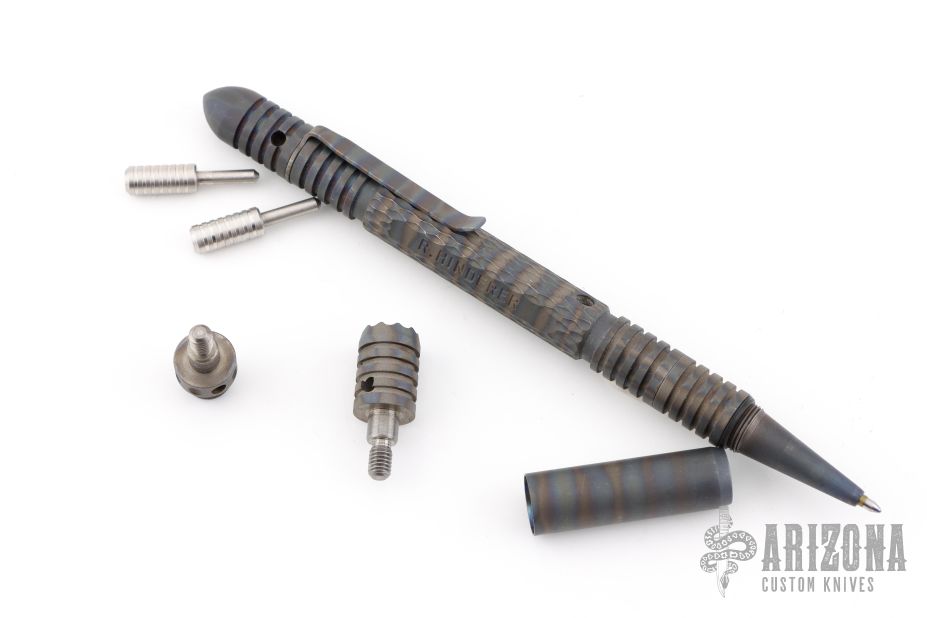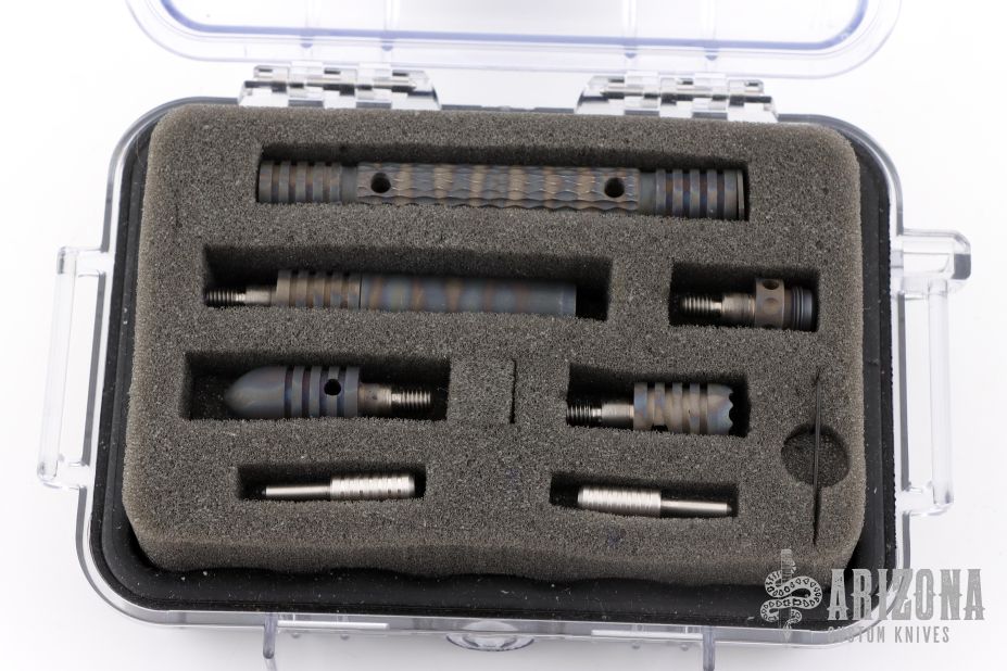 The modular kubaton is a different breed of weapon. Our Modular Kubaton Pens are a unique design of innovation, CNC and CAD/CAM technology. By utilizing modern equipment and computer software we have taken the kubaton to a whole new level. Adding texture to the body assures the user of a no-slip grip. A choice of easy to change attachments, allow the user to configure it as a utilitarian pen or a kubaton. Not only is the modular kubaton an effective self-defense tool, but it is just plain fun to handle. With a selection of different end attachments, your pen can be configured to meet the mission requirements. Includes original hard case. Excellent condition.