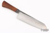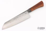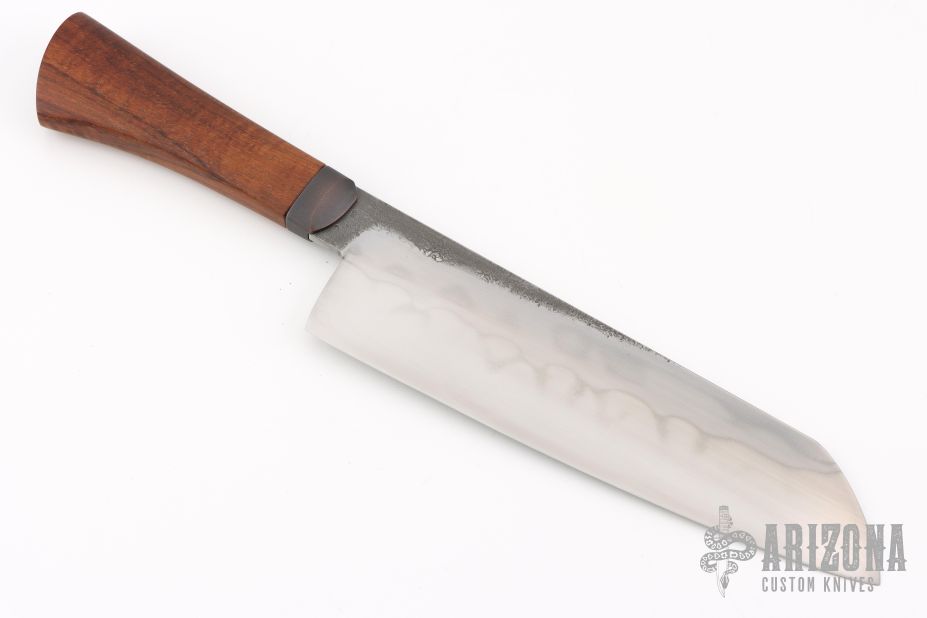This Chef Knife by Journeyman Smith Justin Cheault features a hand rub satin finished blade with hamon, .151" blade stock and 2.186" blade depth, hidden tang construction. The handle has an antiqued copper guard, curly koa wood grip. Comes with a zippered case and COA. New from maker at the 2025 Blade Show.